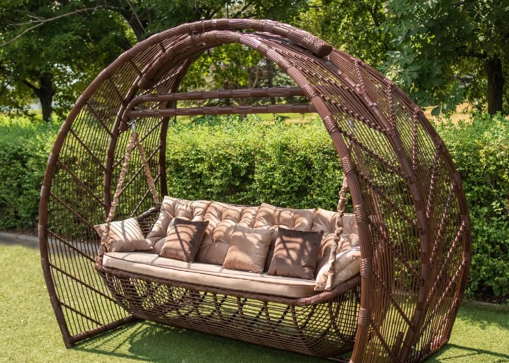 Мы предлагаем вам приобрести матрас, предназначенный для плетёных садовых качелей со спинкой. Для изготовления могут быть использованы разные мебельные ткани, имеющие разную фактуру, а также цвета. Благодаря завязкам подушка надёжно прикрепляется к основанию мебели. В качестве наполнителя используется поролоновая крошка, подушка простегана пуговицами. Вес подушки составляет 6 кг, а объём 0,3 м³, изготовлена такая подушка может быть из рогожки, микрофибры, либо же шенилла.